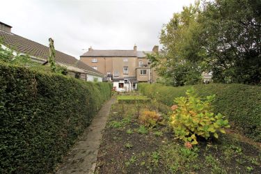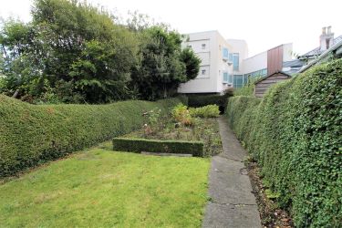 Large East facing rear garden with mature hedge boundary, in lawn with attractive planted beds and